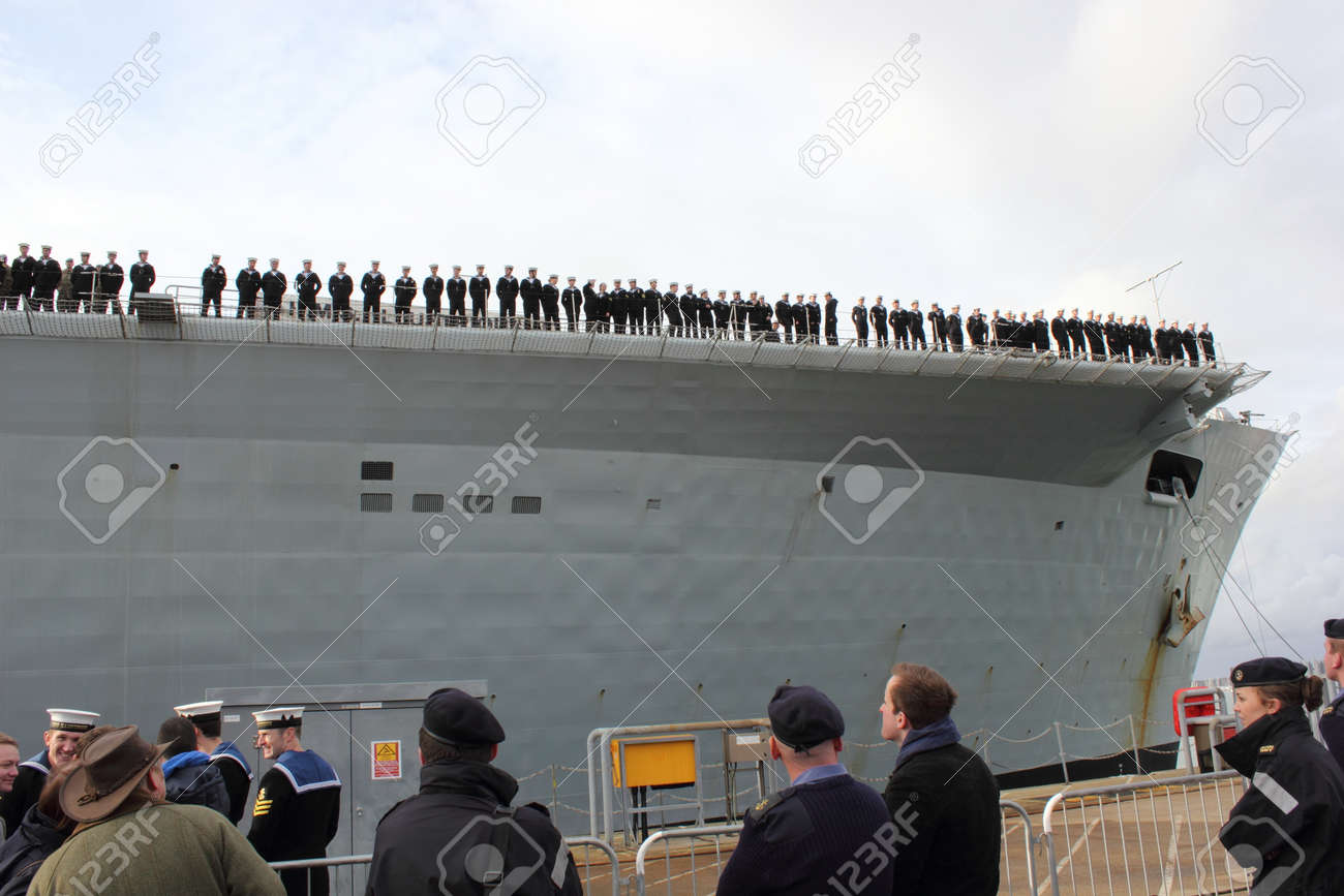 ポーツマス イングランド 14 年 1 月 10 日 Hms イラストリアス空母を返しますポーツマスに船の乗組員とフィリピンへの展開が帰国のためデッキに並んだ後 の写真素材 画像素材 Image
